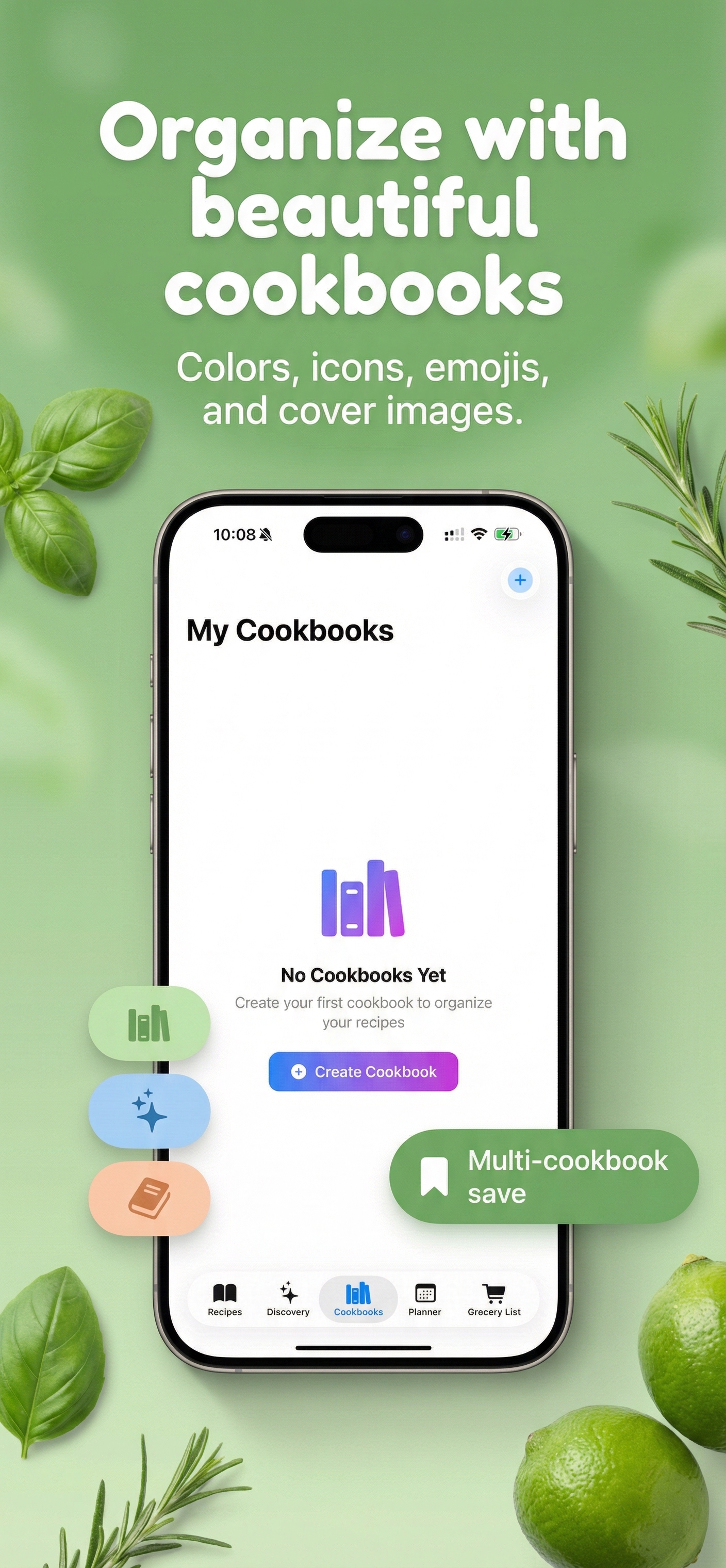 Create custom collections with personalized covers. Icons, emojis, or your own photos — make each cookbook uniquely yours.